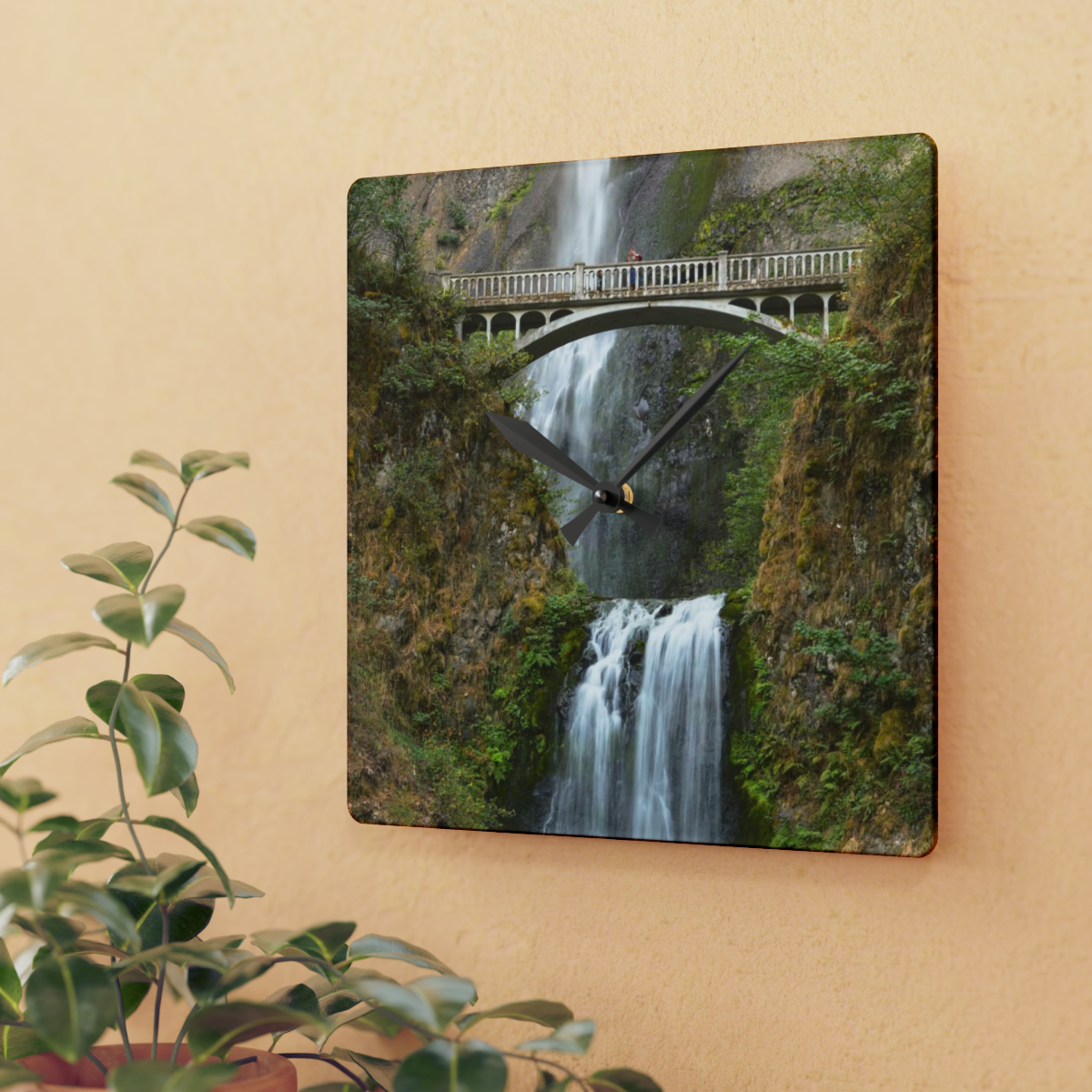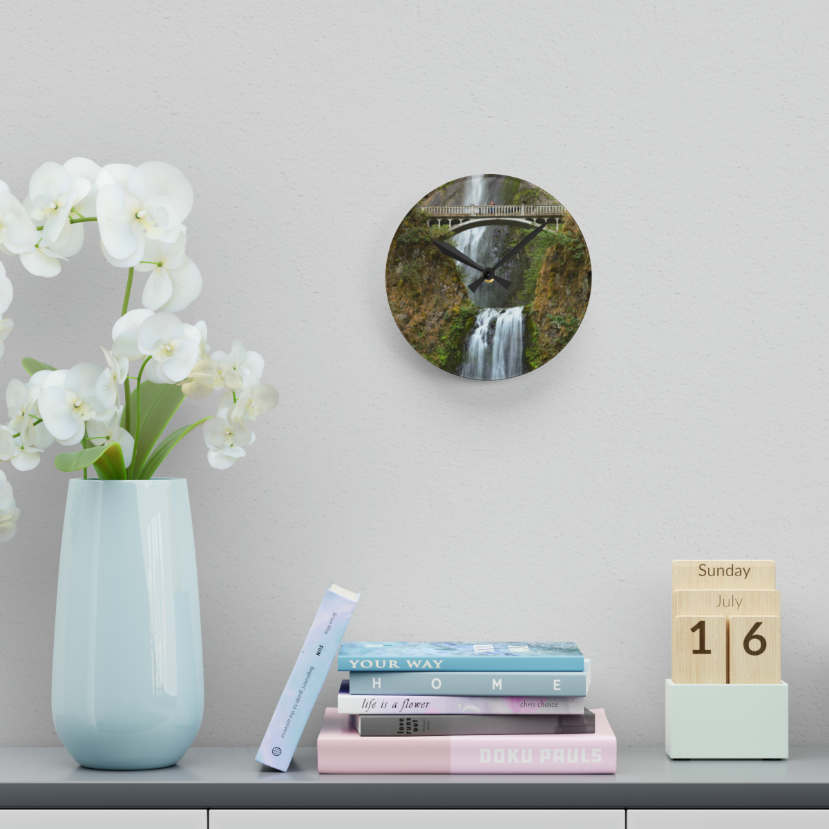 These clocks come in two shapes (round and square) and two sizes. Each clock has a keyhole at the back for easy hanging on a wall. They’re made from an acrylic material that looks like glass but is more durable and sturdy.